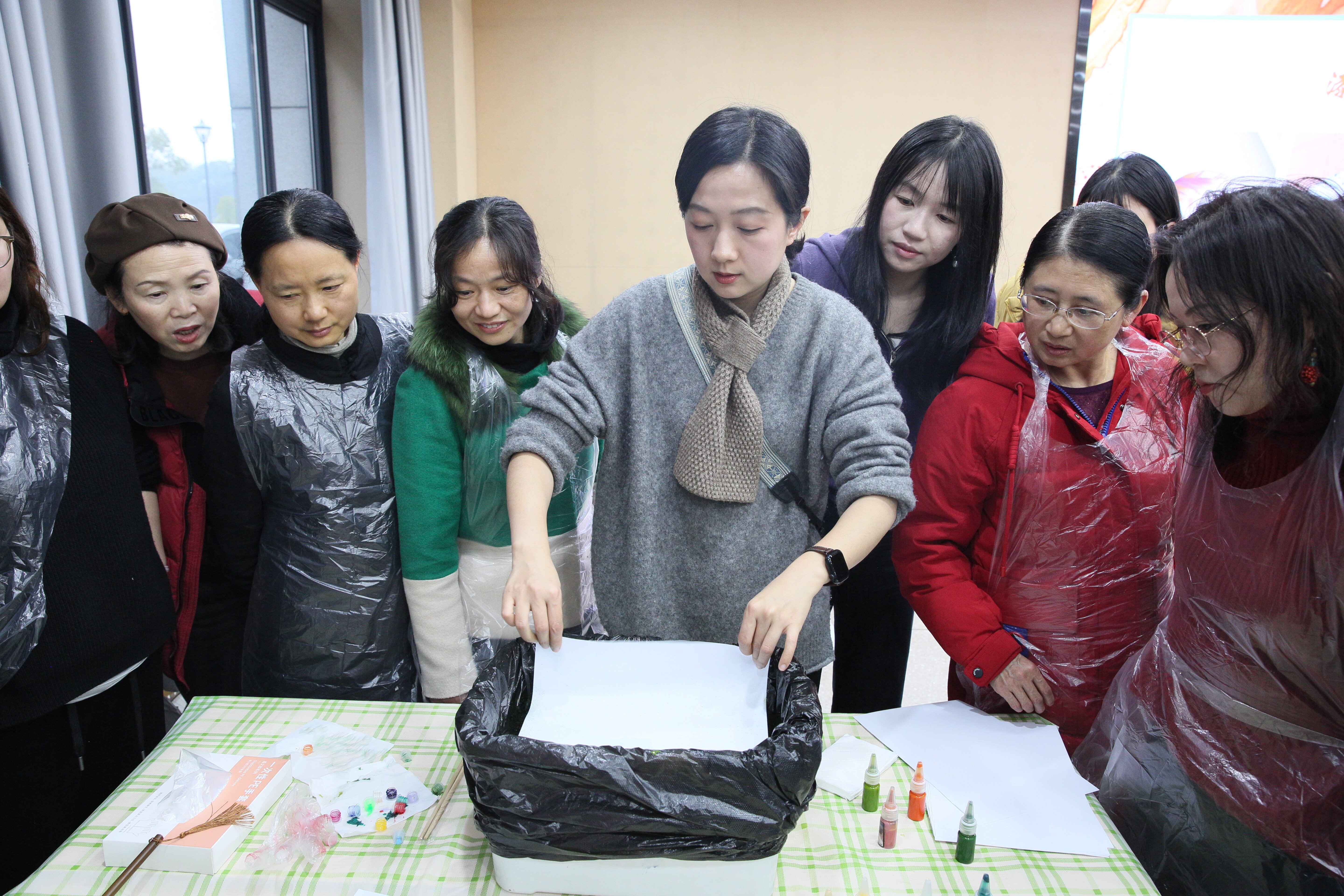 随后,四夕造物手作驿站负责人罗丹老师为现场教职工讲解漆艺文化历史、漆扇制作技巧与色彩搭配要点,并示范制作步骤。大家动手制作漆扇,在沉浸式体验中感受传统漆艺的魅力,亲手制作出独具特色的漆扇作品。